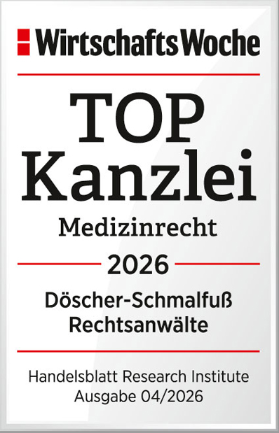 Bereits zum achten Mal wurde in der Ausgabe 04/2026 des renommierten Magazins WirtschaftsWoche in Kooperation mit dem Handelsblatt Research Institute unsere Kanzlei als „WirtschaftsWoche Top-Kanzlei für Medizinrecht“ in Deutschland benannt. Über diese erneute Auszeichnung freuen wir uns sehr. Um in diese Position der Spitzengruppe zu kommen, mussten sich Kanzleien in drei Jury-Runden unter mehreren Hundert Medizinrechtskanzleien durchsetzen. Dazu wurden in einer Peer-Group-Befragung alle Medizinrechtsanwälte zur Bewertung gebeten, wobei Eigenbewertungen ausgeschlossen waren. Der Erfolg ist uns Ansporn, auch zukünftig im besten Interesse unserer Mandanten kompetente und zielstrebige Arbeit zu leisten.